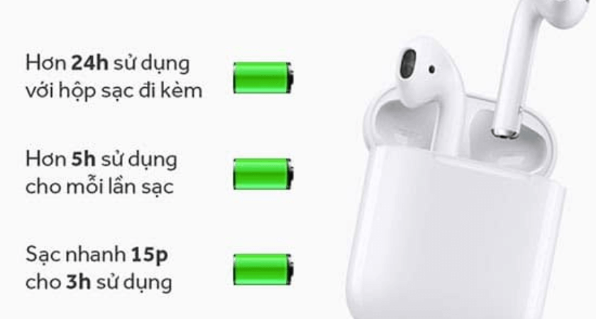 Lưu ý rằng thời gian sử dụng pin thực tế có thể biến đổi tùy thuộc vào nhiều yếu tố như âm lượng sử dụng, tính năng được kích hoạt, và tuổi của AirPods.