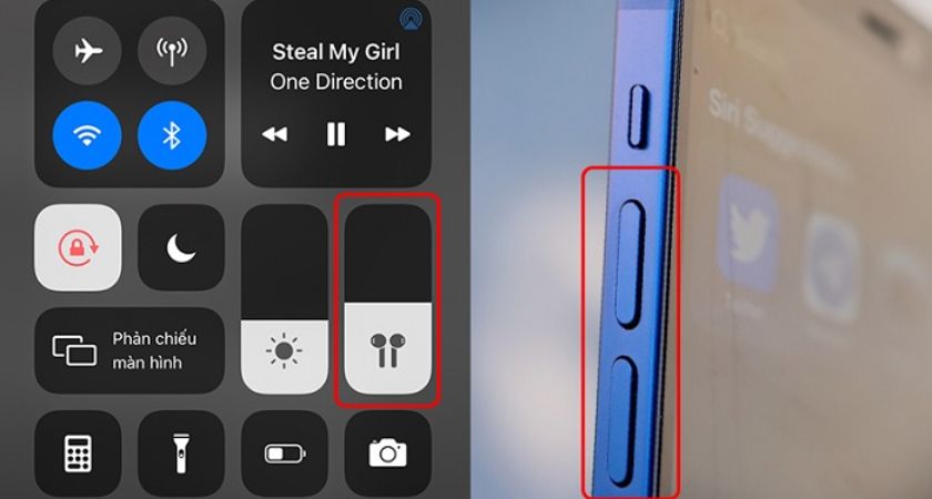 Bạn có thể điều chỉnh âm lượng tai nghe AirPods gián tiếp thông qua điện thoại iPhone đã kết nối bằng cách nhấn nút tăng giảm âm lượng bên cạnh sườn iPhone hoặc điều chỉnh cột âm lượng tại trung tâm điều khiển của iPhone