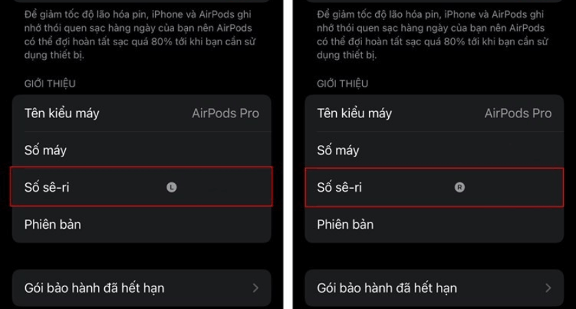 Lưu ý: Trên iOs/iPadOS 14 trở lên, bạn còn có thể kiểm tra số serial của từng bên tai nghe airpods bằng cách nhấn vào dòng mã số serial ở mục giới thiệu ( about )