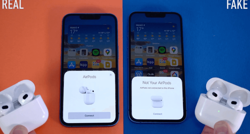 Trên Apple AirPods 3 fake , bạn sẽ nhận được thông báo “không phải AirPods của bạn”, trong khi trên Airpods 3 thật, bạn sẽ chỉ nhận được thông báo “AirPods”. Bạn có thể xem qua hình minh họa dưới đây: